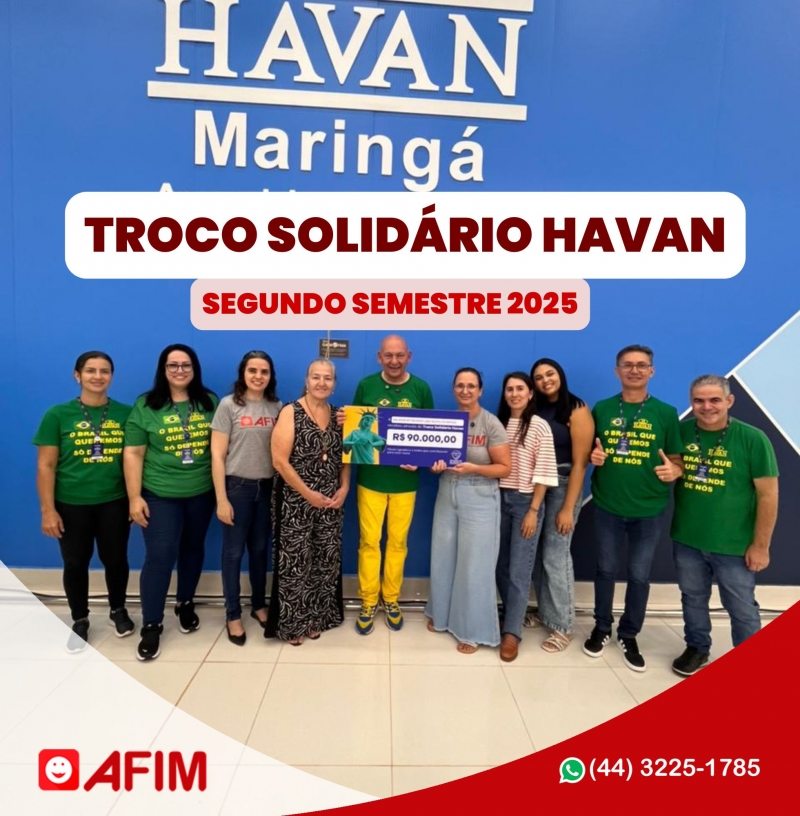 Durante o segundo semestre de 2025, participamos do Troco Solidário da Havan (no período de 1° de julho a 31 de dezembro). Os clientes puderam contribuir com esta campanha, fazendo suas doações nas unidades da Havan em Maringá. O valor arrecadado foi de R$90 mil reais.